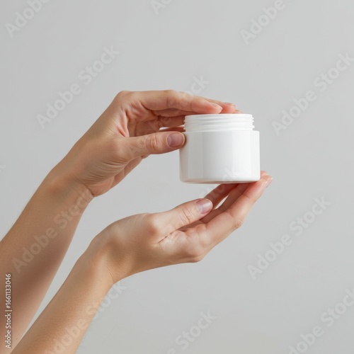 Hands Holding White Cosmetic Jar, Mockup for Skincare Product, Blank Packaging Design.