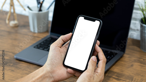 Hands of a businessman using a smartphone mockup at his desk, Mobile phone blank screen for editing graphics.