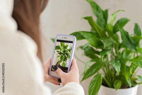 Hands of a female florist blogger photographing a home plant Spathiphyllum in a pot on a mobile phone. Home plant breeding, gardening, working online social media influencer. Soft selective focus.