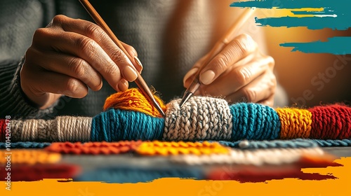 Hands of a skilled crafter knitting with a mix of vibrant yarns, cozy and creative atmosphere, artisanal handicrafts, textured fibers
