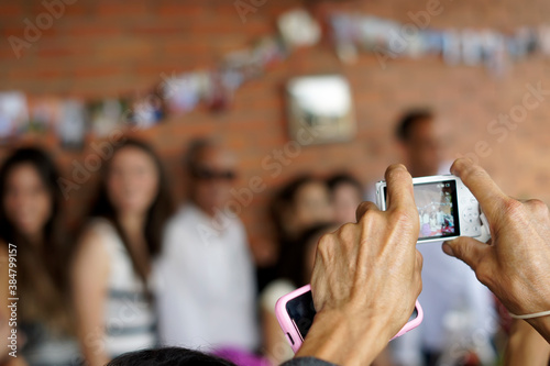 Hands of a woman taking a picture of a celebration. Defocused background