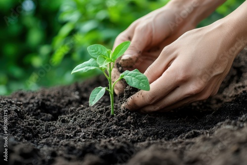 Hands Planting a Seedling: A close-up of hands planting a small seedling in rich, dark soil. The image should convey the hope and nurturing required to grow food, with a green, leafy background slight
