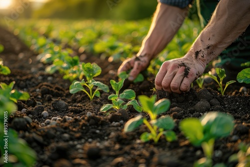 Hands planting young seedlings in fertile soil at sunset, nurturing growth and sustainability in an organic farm field.