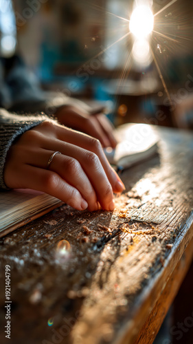 Hands Read a Book on a Rustic Wooden Desk with Sunlit Dust Particles