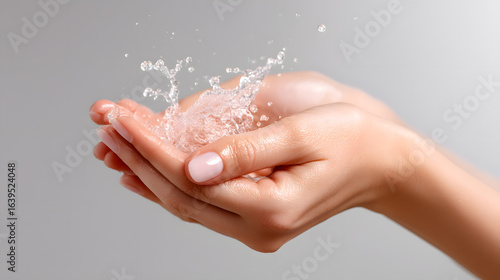 Hands splashing water on skin, symbolizing freshness, hydration, and cleansing for skincare and beauty concepts. Perfect for spa and wellness themes.