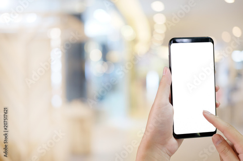 Hands touch on display smartphone screen empty for present on blur background.