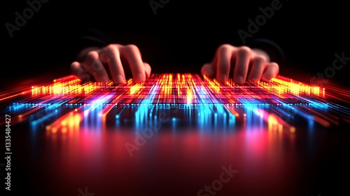 keyboard, hand, typing, technology, futuristic, digital, glowing, light, neon, red, orange, blue, dark, night, screen, datum, code, line, abstract, energy, speed, innovation, progress, network, cyberspace, computer, science, modern, future, interface, design, graphic, illustration, concept, background, cyber, virtual, system, global, web, online, communication