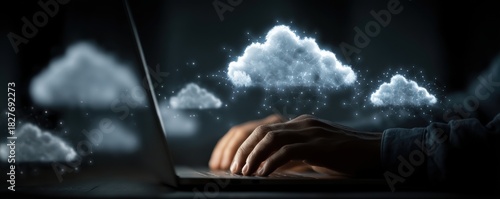 Hands typing on laptop with cloud icons and glow representing cloud storage and digital data
