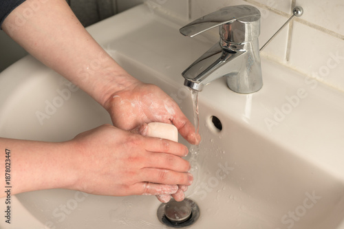 Hands washing with soap under running water in a bathroom sink. Close-up of personal hygiene, cleanliness, handwashing routine, health and infection prevention concept.