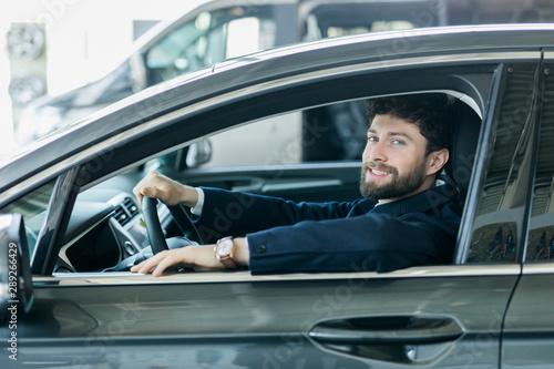 Handsome bearded man is sitting in a new car in car dealership