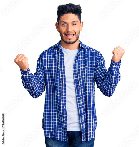 Handsome latin american young man wearing casual shirt screaming proud, celebrating victory and success very excited with raised arms