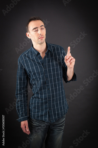 adult, alcohol, black background, brown hair, casual attire, drunk, facial expression, fashion model, fun, jean, male, man, one man only, one person, people, shirt, standing, studio shot, caucasian