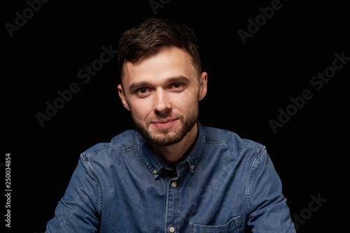 man, denim, guy, beard, stubble field, black background, male, brown hair, smile, front view, indoor, 20s, confidence, young, portrait, model, face, student, adult, horizontal, photogenic, shirt, casual clothes, cheerful, closeup, caucasian, dark, one person, studio shot, casual attire, person, content, positive, happy