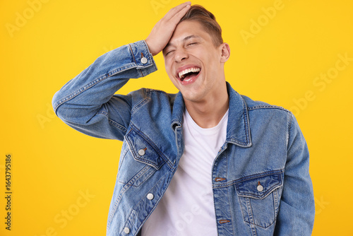 adult, background, candid, care, carefree, casual attire, caucasian, cheerful, chuckle, colours, comic, cute, delight, emotion, enjoy, expression, fashion, feeling, fun, funny, giggle, glad, guy, photogenic, happiness, happy, healthy, human, humor, joke, joy, laugh, laughing, lifestyle, male, man, model, optimistic, person, pleased, positive, relax, rest, satisfied, sincere, smiling, studio, yellow