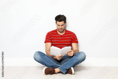 Handsome man reading book on floor near white wall