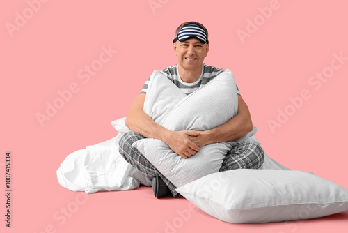 Handsome mature happy man in stylish pajamas with pillows and blanket on pink background