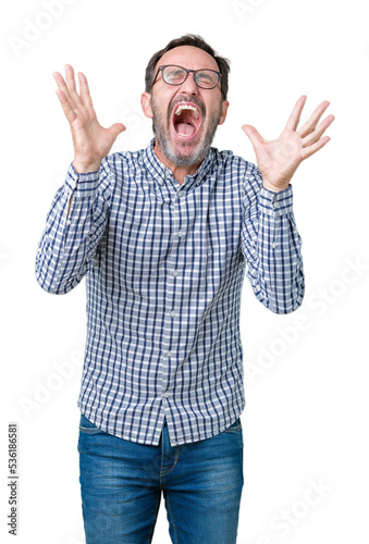 Handsome middle age elegant senior man wearing glasses over isolated background celebrating mad and crazy for success with arms raised and closed eyes screaming excited. Winner concept