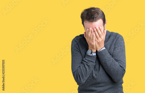 Handsome middle age senior man wearing a sweater over isolated background with sad expression covering face with hands while crying. Depression concept.