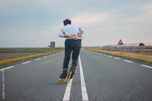 Handsome young athlete rollerblades on Dutch roads to improve endurance and fitness. A young man trains stability and enjoying the fresh air. Sport lifestyle