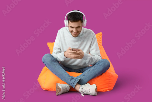 Handsome young happy man in headphones with mobile phone resting on beanbag chair against purple background