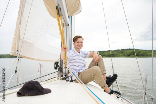 man, yacht, young, sailor, boat, white, travel, short, adult, caucasian, sky, sea, male, confident, lifestyle, photogenic, sail, sailboat, person, looking, sailing, space, outdoors, nautical, equipment, stylish, sunshine, rope, sunglasses, bare, foot, away, eyeglass, crew, boating, bearded, shirt, forward, summer, modern, smiling, water, attractive, standing, 1, spring, season