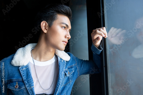 Handsome young man posing on vintage dark background. Portrait of satisfied Asian man against wall. Close up face of fashionable Asian man on wall background.