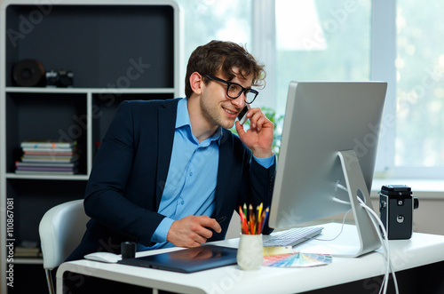 analysing, attractive, beautiful, brunette, business, casual attire, caucasian, computer, connection, contemporary, cute, desk, enjoyment, male, goggles, happy, home, house, interior, cyberspace, job, joy, looking, mobile, mobility, notebook, note, office, phone, photogenic, reading, sitting, smart, smile, technology, telecommuting, man, work, young, success, successful, smartphone, talking