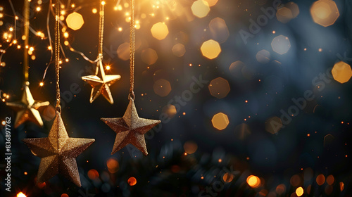 Hanging golden Christmas stars on golden bokeh particles background copy space for text