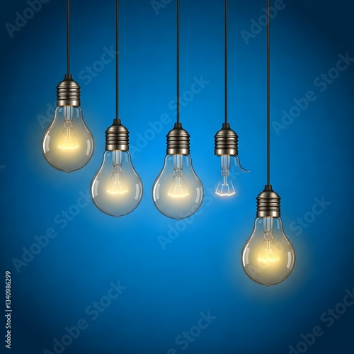 Hanging Light Bulbs with One Broken Bulb on a Blue Background. PNG