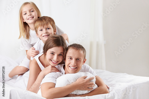 20s, 30s, bed, bedchamber, boy, caucasian, children, children, father, daughter, day, embracing, family, father, female, fun, girl, happiness, home, indoor, children, laughing, lifestyle, looking, love, male, man, morning, mother, eltern, people, playful, playing, portrait, pajama, reclining, relaxing, smiling, son, sunlight, white, window, woman, young