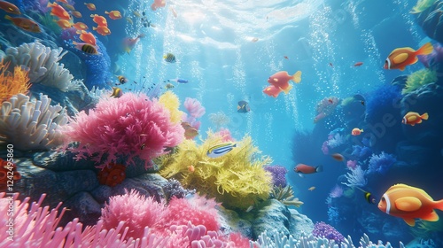 Happy 3D peach snorkeling in a coral reef
