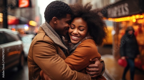 Happy African American couple hugging on the street in the city.