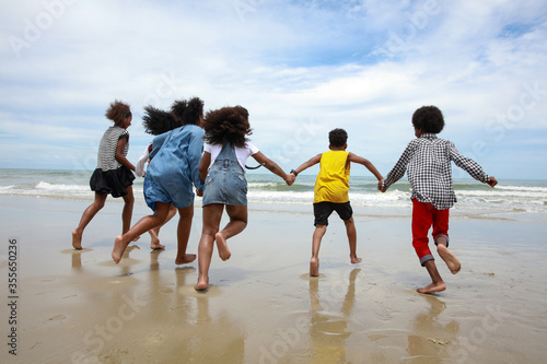 Happy and funny children hand in hand running in to sea among summer vacation