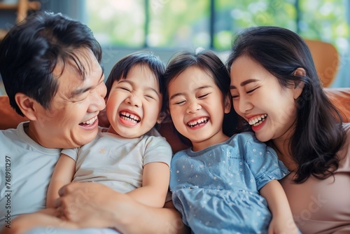 Happy asian family enjoying weekend and laughing together at home