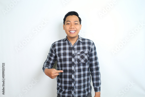 happy asian man pointing hand with smiling face and confident gesture isolated on white backgroun wearing plaid shirt