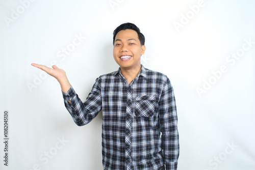 happy asian man presenting hand with smiling face and confident gesture isolated on white backgroun wearing plaid shirt