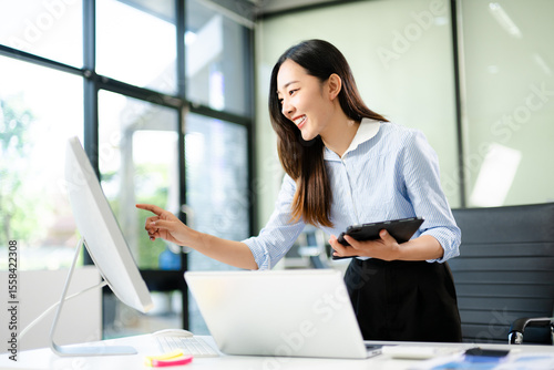 Happy Asian woman using tablet and touchscreen desktop in bright office. Modern business, tech, success, productivity