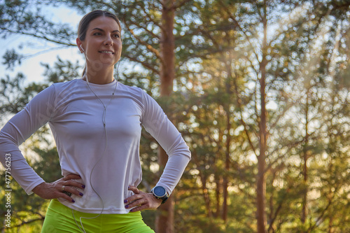 Happy athletic woman is getting ready to start training in the fresh air and get a boost of energy for the whole day. Concept of sports and a healthy lifestyle