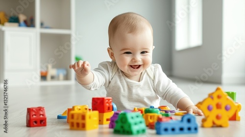 Happy baby joyfully playing with colorful toys in a bright and cheerful indoor environment filled with smiles