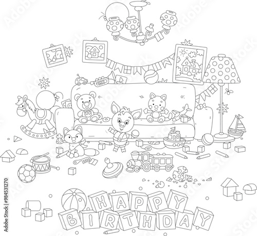 birthday, happy birthday, greeting card, birthday party, baby pig, pig, baby pig, disorder, mess, frolic, mischievous, romp, merriment, baby, babyhood, children, children, children, childhood, little, toddler, infant, infancy, playroom, childcare center, playing, game, fun, cartoon, vector, drawing, illustration, toy, colouring, black-and-white