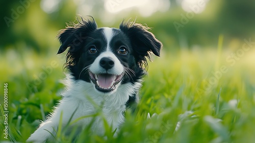 dog, grass, happy, outdoors, animal, pet, canino, lying, field, face, black, white, green, portrait, looking, camera, cheerful, mammal, fur, eye, smile, tongue, teeth, spring, summer, nature, domestic, breed, adorable, cute, fresh, bright, sunny, sunlight, head, ear, nose, mouth, open, joyful, fun, playful, meadow, daytime, bokeh