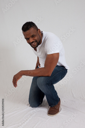 young, photogenic, sitting, portrait, casual attire, isolated, person, white, people, fashion, jean, guy, model, 1, floor, studio, boy, happy, to sit, lifestyle, cheerful, shirt, human, smiling, smile, man, male, cute, attractive, happiness, pleased, pleasure, glad, joyful, joy, black, african, american, kneeling