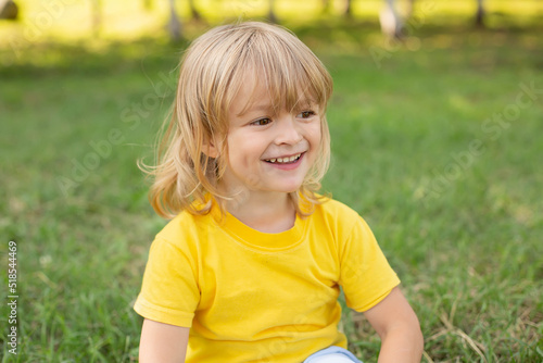 happy blond boy sitting on the lawn in a yellow T-shirt toothy smile