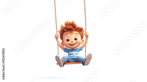 Happy Boy Swing Isolated on White Background. Little Child Male Character Sitting on Rope Teeterboard Enjoy Recreation