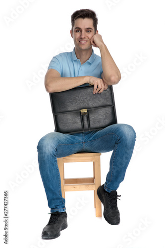 man, young, guy, hold, hand, photogenic, attractive, smart, casual attire, fashion, sexy, elegant, cool, modern, look, portrait, pose, style, happy, smile, studio, background, white, polo, blue, shirt, t-shirt, jean, to sit, seated, chair, isolated, suitcase, briefcase, case, bag, businessman, positive, laugh, optimistic, hopeful, cheerful, jolly, joyful, merry, lean, on, relaxed, calm