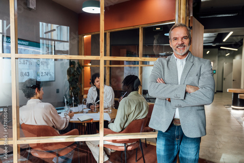 Happy businessman with arms crossed leaning on glass wall