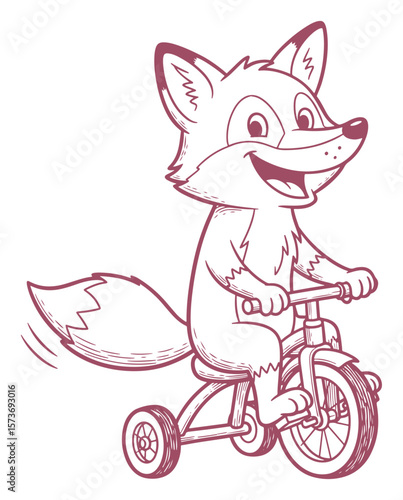 fox, cartoon, tricycle, bike, bicycle, children, fun, happy, cute, illustration, drawing, animal, ride, wheel, tail, line, vector, design, graphic, art, outline, vignetting, purple, cheerful, playful, dynamic, wheel, handlebar, seat, pedal, learning, activity, whimsy, childish, adorable, joyful, movement, fast, speeding