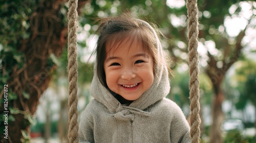 children, swing, smile, joy, happiness, playground, park, fun, outdoors, children, childhood, rope, sweater, portrait, nature, energy, carefree, laughter, play, freedom