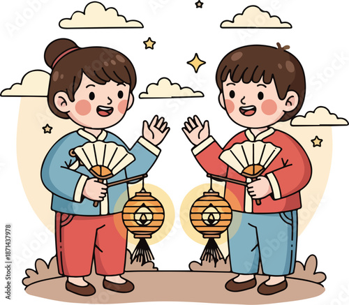 children, festival, asian, culture, celebration, traditional, children, happy, fan, boy, girl, joy, event, holiday, custom, heritage, festive, cheerful, cute, adorable, cartoon, illustration, vector, graphic, drawing, art, design, character, background, sky, cloud, star, night, evening, smile, waving, east, oriental, community, childhood, innocence, light, glow, decoration, attire, clothing, costume, dress
