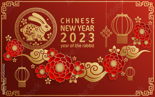 Happy chinese new year 2023 year of the rabbit zodiac with on color Background. (Translation : Happy new year)